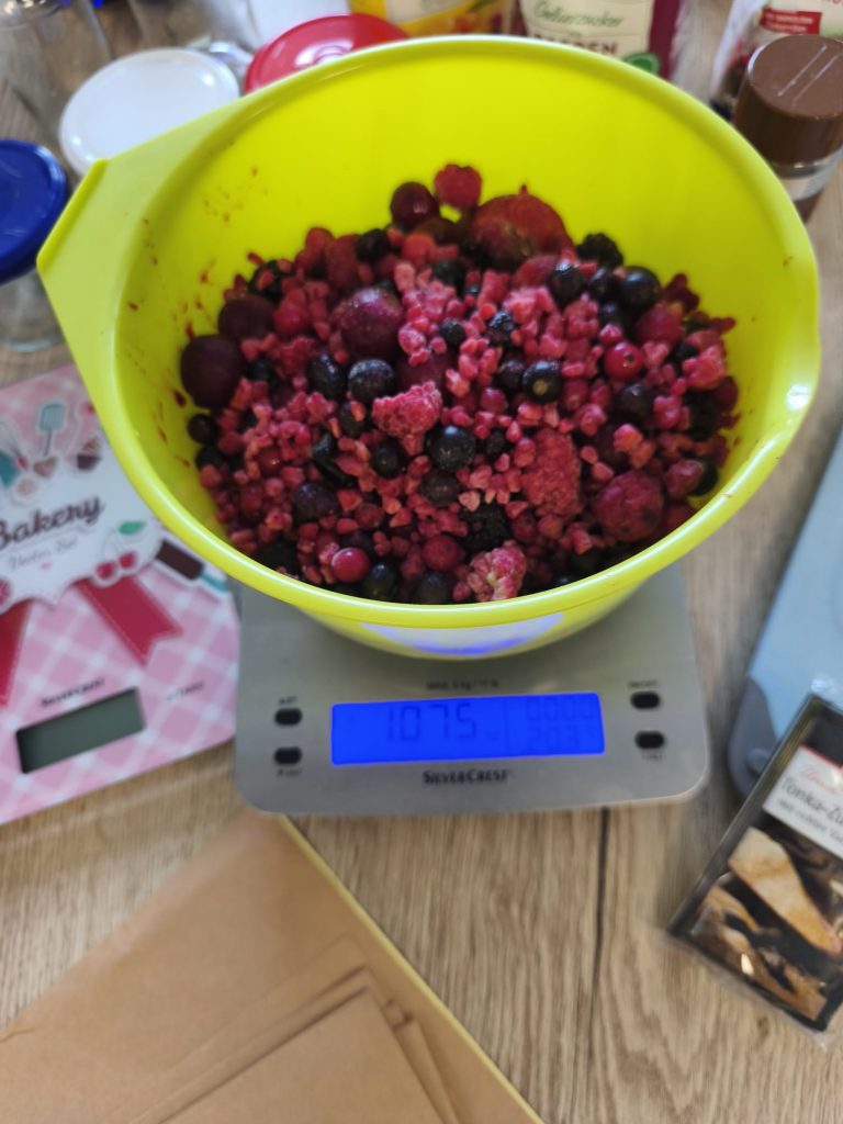 Als erstes rührten wir Brombeeren zusammen mit Johannisbeeren, Himbeeren und Erdbeeren. Nach der Gelierprobe füllten wir die Marmelade in Gläser ab.