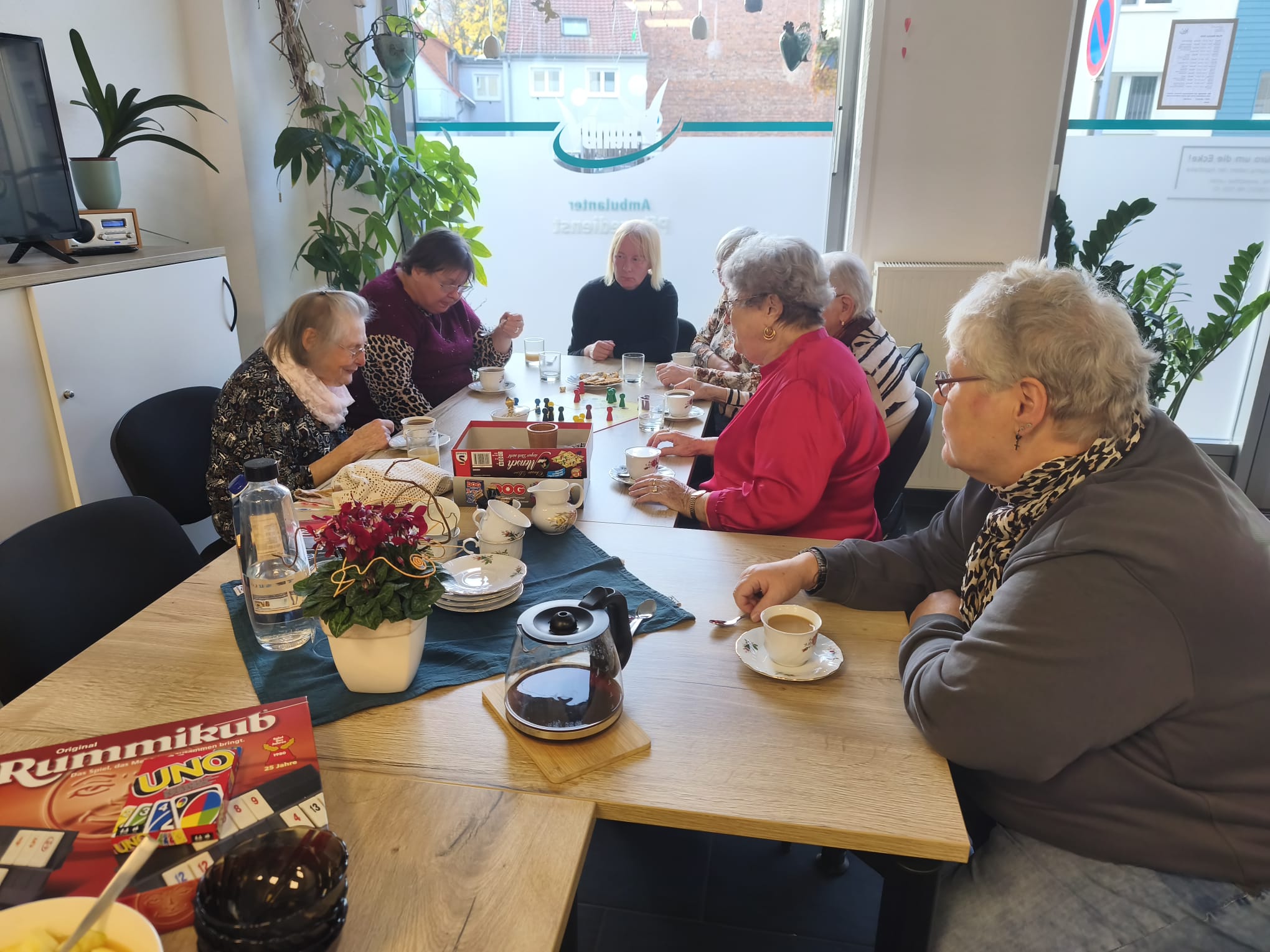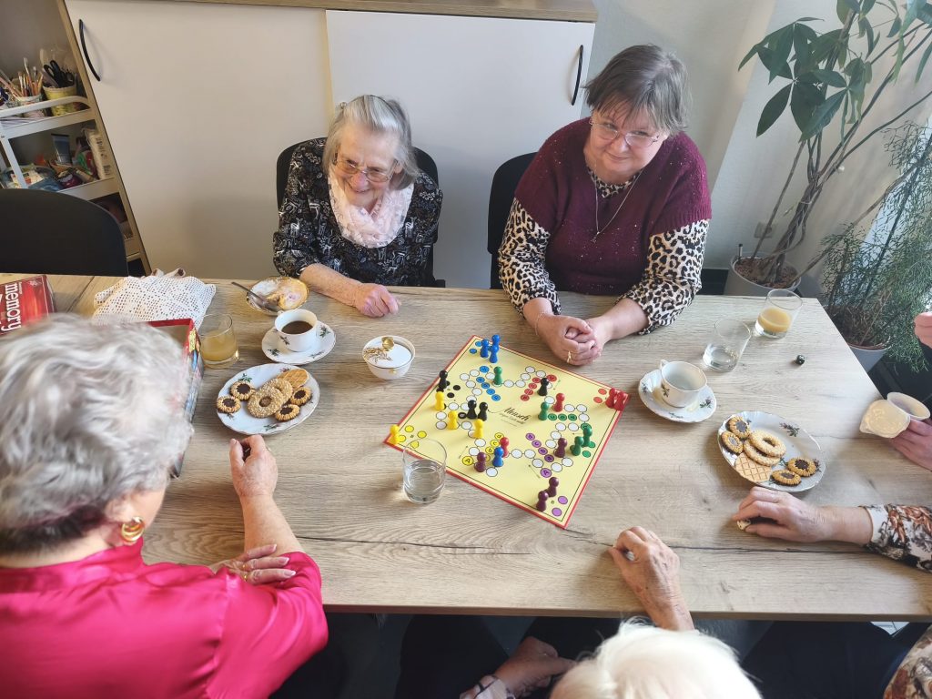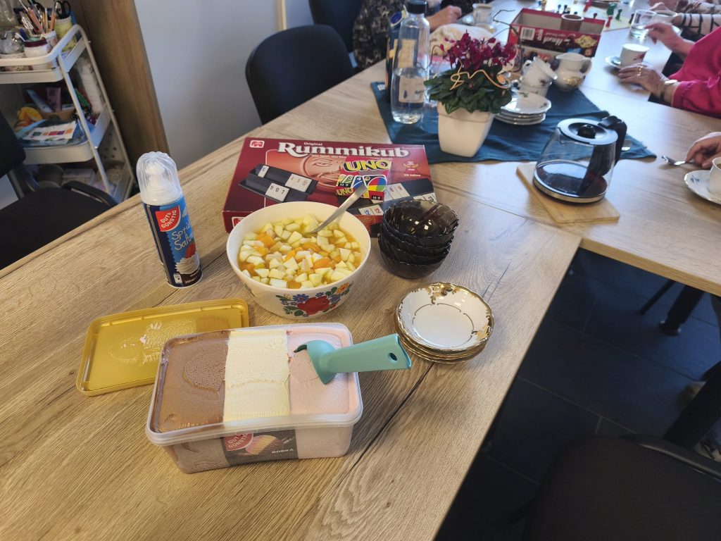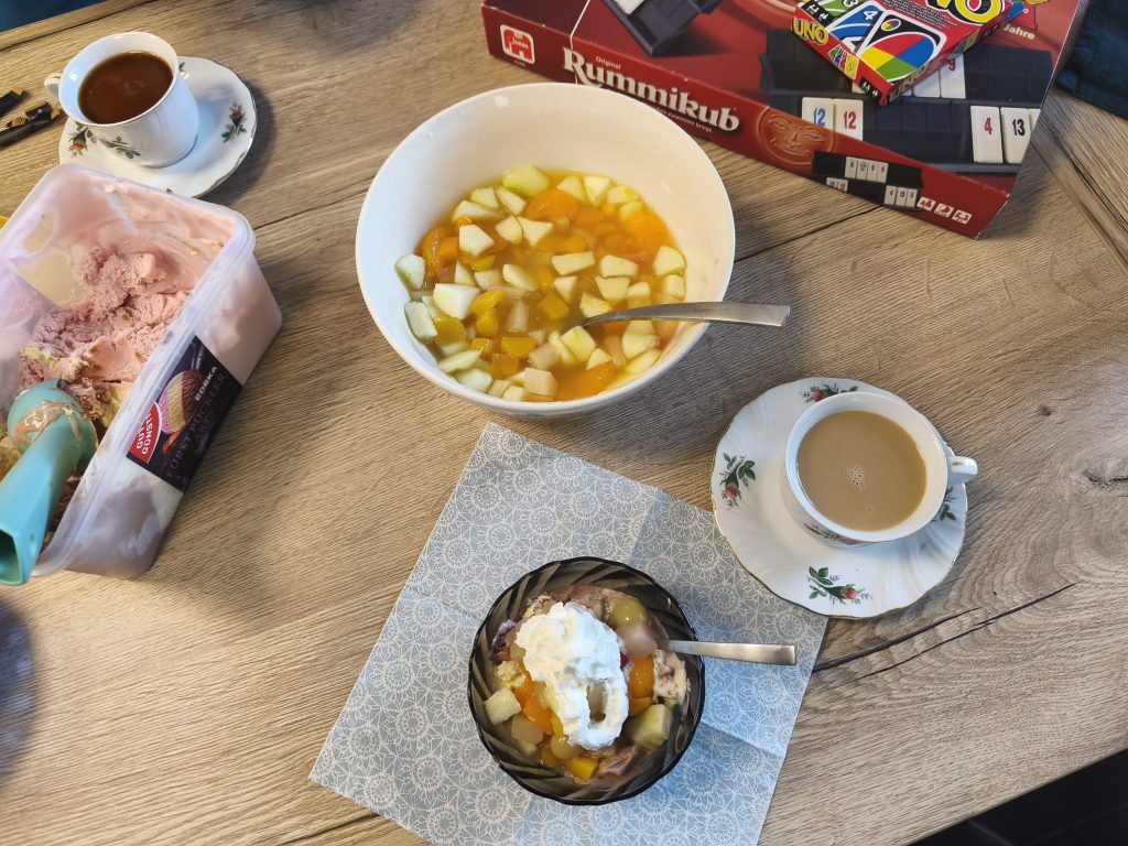 Da das Wetter außergewöhnlich warm war, gab es in der „Kaffeepause“ Eis mit Früchten und Sahne und dann zur Auflockerung eine Runde „Mensch ärgere dich nicht“.